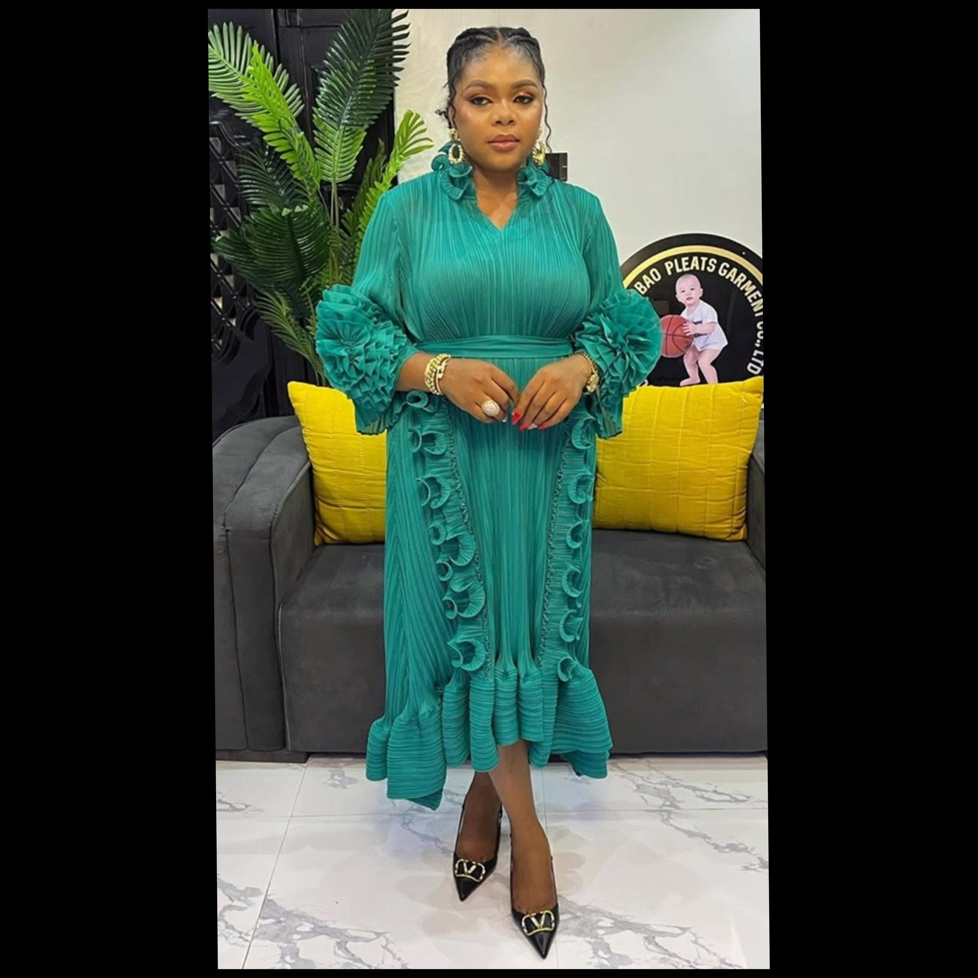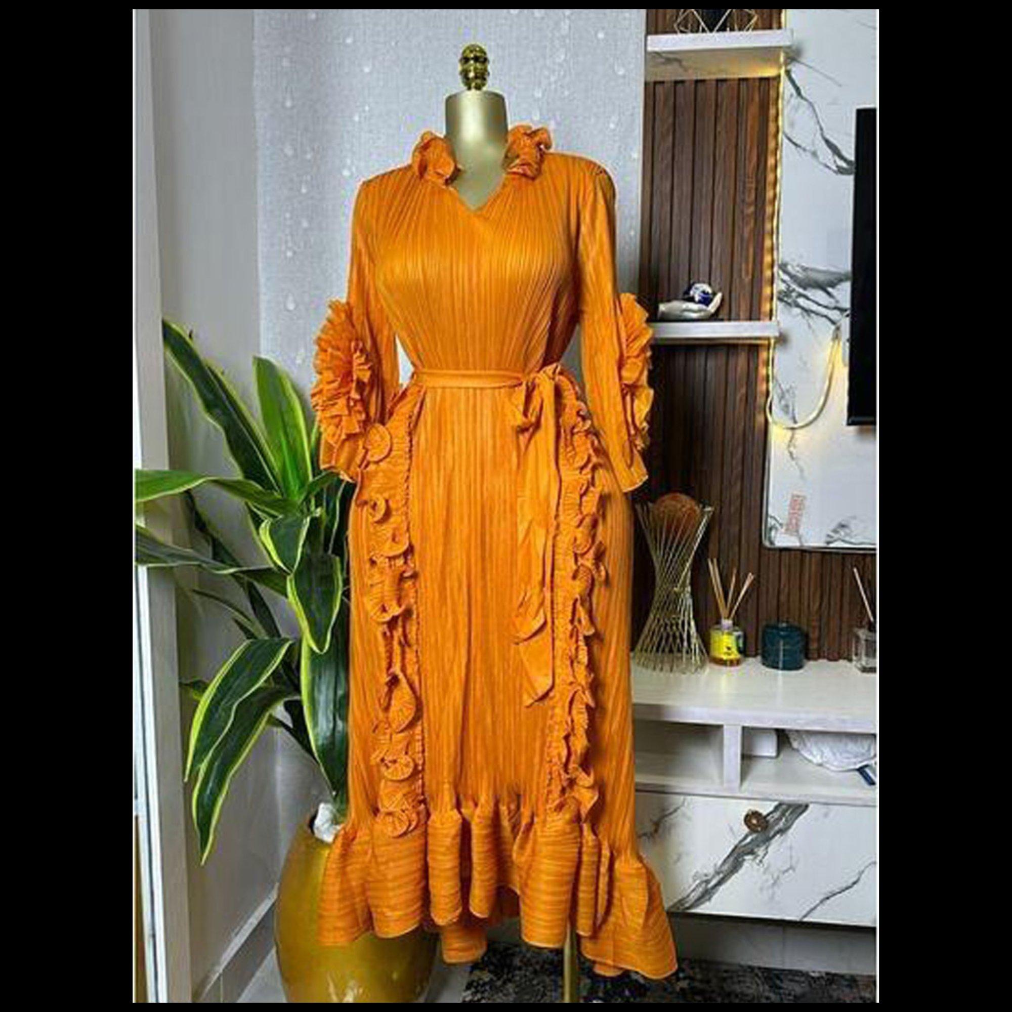 Stretch material. Belted. Ruffle Design. Allow 2-5 business days for delivery
